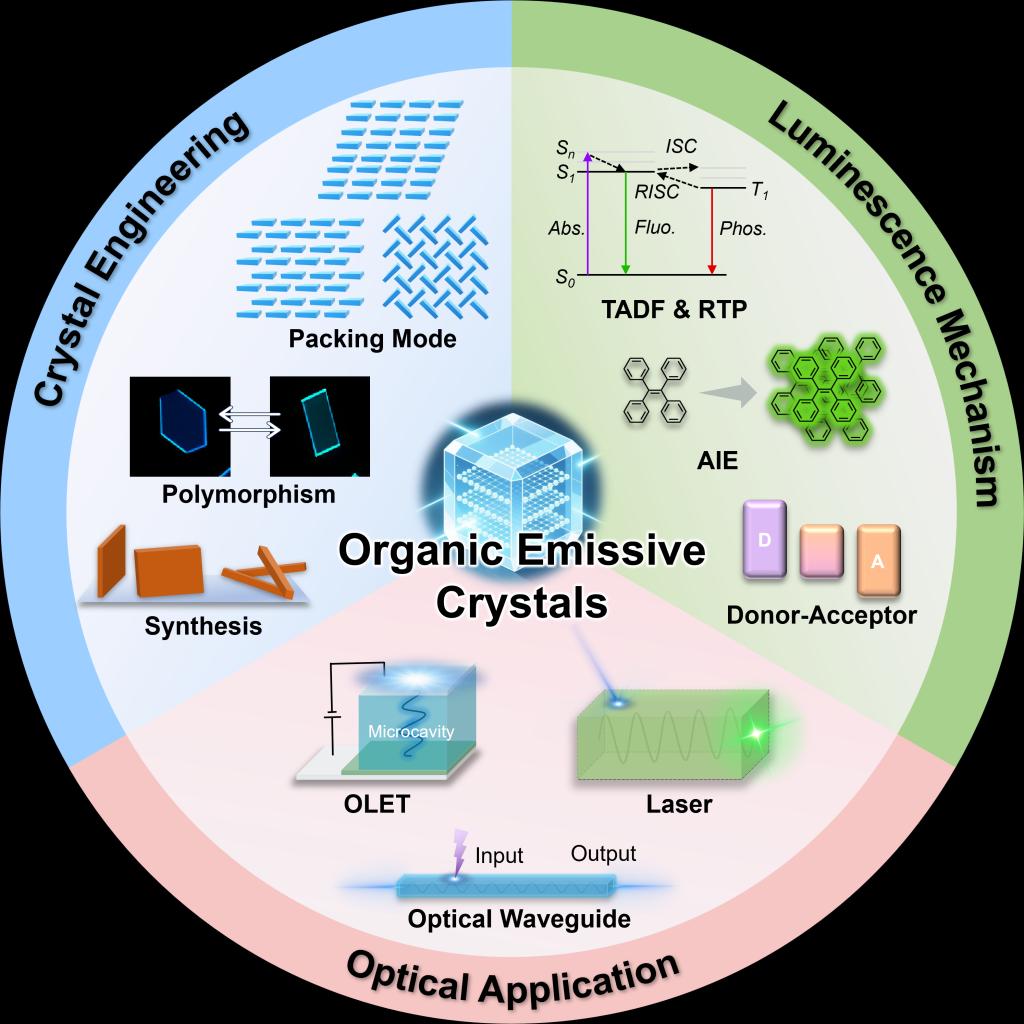 该综述论文围绕“发光有机晶体”这一材料科学前沿方向展开。文章指出,发光有机晶体将晶态材料的优异光电特性与高效发光性能相结合,正迅速成为领域内的研究热点。论文系统梳理了该领域从基础研究到应用探索的全链条进展:在分子设计与发光机制方面,重点阐述了聚集诱导发光、热活化延迟荧光、室温磷光等关键机理;在材料工程方面,探讨了晶体堆积与形貌的调控策略;针对这类晶体独特的光-物质相互作用,深入剖析了其在光波导、受激发射等领域的应用基础;此外,文章还聚焦器件集成前沿,展示了有机发光晶体管、单晶发光二极管、传感器及显示阵列等方向的最新突破。最后,论文展望了有机发光晶体材料在下一代光电技术中所面临的挑战与未来机遇。